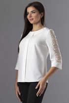 Блуза женская из текстильной ткани . Прямого силуэта. По спинке расположен подрез. В шов вставлено кружево. Рукав спущенный с манжетой. По плечевому шву  вставлено кружево. Вырез лодочка. Обработан притачной бейкой.