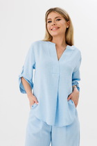 Блуза женская из текстильной ткани. Прямого силуэта. По спинке расположен подрез. В шов вставлено кружево. Рукав спущенный с манжетой. По плечевому шву  вставлено кружево. Вырез лодочка. Обработан притачной бейкой.