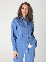 Рубашка женская прямого силуэта с центральной застёжкой на петли и декоративные пуговицы, выполнена из хлопчатобумажной ткани. Боковые швы полочки и спинки имеют фигурную форму и соединяются между собой застёжкой на петли и декоративные пуговицы. Воротник рубашечный, отложной на стойке. Рукав втачной, одношовный, длинный с манжетой, которая застёгивается на петлю и пуговицу, и патой, которой регулируется длина рукава. Низ рубашки разноуровневый, полочка короче, спинка -длиннее.