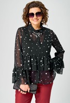 Блуза свободного кроя с ассиметричным отложным воротником. Рукав цельнокроенный с притачной манжетой. Ассиметричная сквозная застёжка на петлю и пуговицу. По спинке декоративная складка. Правая часть блузки короче левой на 4 см. Длина изделия 61 см (по короткой стороне)