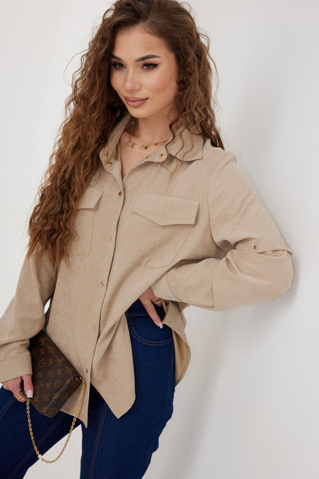 Блузка из плательно - блузочной ткани свободного силуэта. Спинка с кокеткой и встречной складкой. По переду центральная застежка на кнопки, сверху накладные карманы с клапанами. Втачной рукав с отстегивающейся нижней частью. По низу рукава манжет с кнопкой. Воротник рубашечный со стойкой.