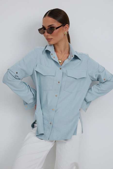 Блузка из плательно - блузочной ткани свободного силуэта. Спинка с кокеткой и встречной складкой. По переду центральная застежка на кнопки, сверху накладные карманы с клапанами. Втачной рукав с отстегивающейся нижней частью. По низу рукава манжет с кнопкой. Воротник рубашечный со стойкой.