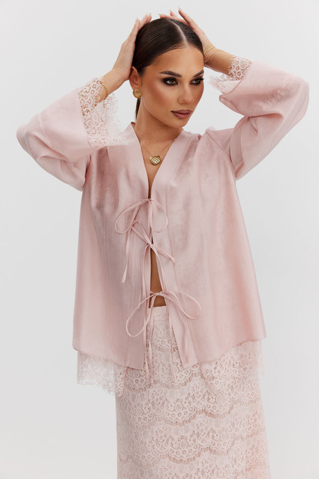 Блузка женская свободного силуэта, из полупрозрачной вуали. Спинка и перед на кружевной подкладке. Застежка на планку с тремя завязками. Рукав втачной длинный расширенный книзу, по низу рукава кружевная широкая манжета, имитирующая многослойность.