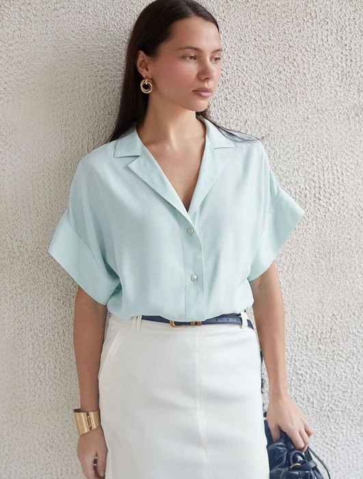 Блузка светло-оливкового цвета сочетает в себе комфорт и элегантность благодаря материалу из вискозы с лиоцеллом. Аккуратный отложной воротник подчеркивает утонченность образа, а широкие короткие рукава привлекают внимание и делают силуэт современным. Спущенная линия плеча формирует расслабленный, но стильный внешний вид, что идеально для тех, кто ценит индивидуальность и уверенность в деталях. Крой продуман так, чтобы подчеркивать достоинства фигуры и на больших размерах, создавая гармоничный силуэт без лишних усилий. Ткань из вискозы с добавлением лиоцелла обеспечивает приятные ощущения и отличную посадку, струится на теле и охлаждает в жаркую погоду. Рубашка легко впишется как в деловой гардероб, так и в повседневный стиль, позволяя выглядеть безупречно независимо от ситуации.