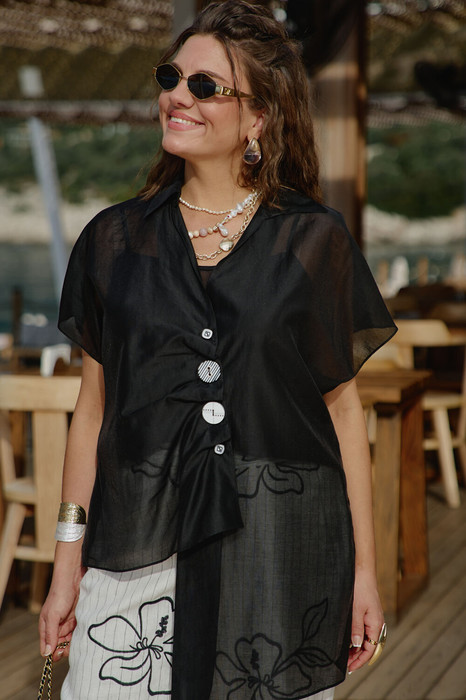 Комплект женский двух предметный, состоящий из блузки и блузы. Блузка свободного силуэта с ассиметричной линией борта с заложенными складками, имитацией застёжки на декоративные  пуговицы. Горловина в блузке с отложным воротником со стойкой.  Рукав в блузке цельнокроеный. Спинка с отрезной кокеткой. Низ в блузке ассиметричный с разрезами в боковых швах. Блуза прямого силуэта на регулируемых бретелях со вставкой эластичной тесьмы-резинке по спинке. В боковых швах от низа разрезы. Обращаем Ваше внимание, что фурнитура может незначительно отличаться от фото. Длина блузы спинки от плеча 69 см(р.52-56), 72 см (р.58-60). Длина переда правого 70 см (р.52-56), 73 см (р.58-62). Длина переда левого 84 см (р.52-56), 87 см (р.58-62). Блузка (топ) 43 см (р.52-56), 45 см (р.58-62).