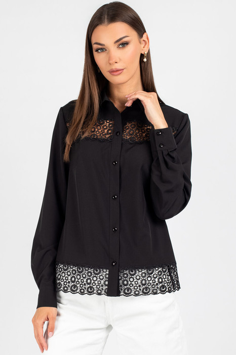 Передняя часть c нагрудными выточками, обеспечивающими комфортную посадку. Центральная бортовая застёжка — на 6 или 7 пуговиц (в зависимости от размера), придаёт образу классическую завершённость. Особое внимание привлекает кружево, изящно нашитое в верхней и нижней части переда — оно добавляет лёгкости и утончённости, делая блузку особенно женственной.