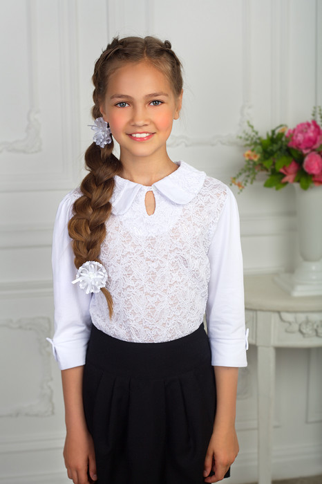 Блузка с комбинированным воротником и полочкой из ажурного трикотажного полотна,с рукавом,заканчивающимся фигурным манжетом с бантом.Рекомендована для школы.