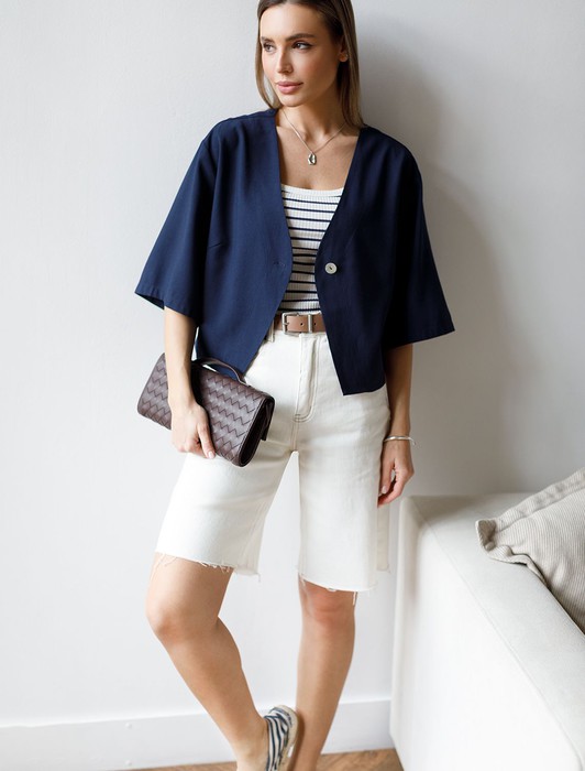 Состав: 70%Лиоцелл (Вис) 30%ПЭ Параметры модели на первом фото: Рост 172, бюст 88, талия 64, бедра 88Блузка свободного кроя в стиле кимоно выполнена из плотного лиоцелла. Модель со спущенным плечом и застежкой на одну пуговицу. Ткань изделия отлично держит форму, плавно драпируется и не просвечивает. В теплое время года приятно охлаждает кожу. Добавление синтетических волокон в составе изделия, предотвращает сминаемостьи поддерживает формоустойчивость. Блузка сочетается в костюме с брюками D24.261, D24.265, D24.267, шортами D28.057 и юбкой D24.261, а также очень эффектно с белыми шортами и джинсами.
