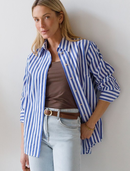 Состав: 65%Хлопок 35%ПЭ Плотность: 100 Г/м2 Параметры модели на первом фото: Рост 170, бюст 89, талия 63, бедра 92Блузка свободного силуэта выполнена из смесовой струящейся ткани. Модель в вертикальную полоску дополнена золотистыми рельефными пуговицами. Свободный силуэт подходит для любой фигуры. Для идеального роскошного образа используйте в качестве низа брюки светлых тонов. На спинке изделия фирменный металлический логотип бренда.