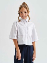 Блуза из тонкой и хорошо драпирующейся ткани прямого силуэта, с короткими втачными рукавами- "крылышки" в 2 яруса, с круглым вырезом горловины. Низ присборен эластичной строчкой. Изделие комплектуется топом