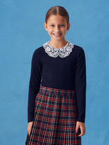 Блузка для девочки из трикотажного полотна с коротким рукавом-фонарик со сборкой по окату и нижнему срезу рукава. Вырез горловины округлый, оформлен кружевной тесьмой.На полочке декоративная планка.
