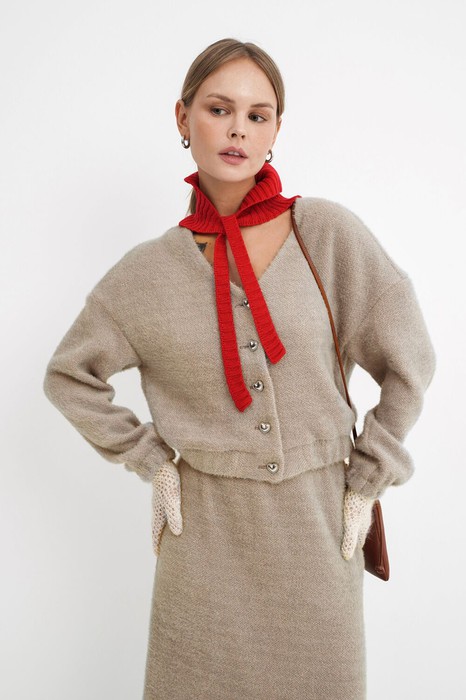 Детали: спущенная линия плеча, V-образный вырез горловины переда, застежка на петли и пуговицы, рукава и низ на резинке, подкладка.