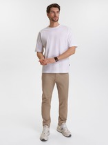 Брюки мужские, с карманами на молнии. Под левым карманом вышивка и принт-надпись. Внизу с двух сторон принт-полоски. С левой стороны полоски дополнены принтом в виде молнии.