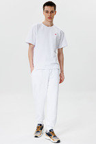 Брюки мужские спортивные. Боковые карманы и карман сзади на молнии. Спереди, около кармана небольшой принт в виде надписи. По боковому шву однотонные лампасы. Низ на манжетах.