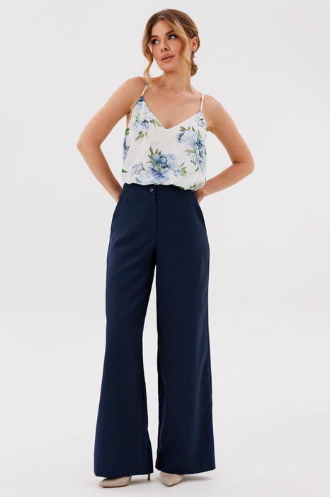 Брюки прямого силуэта на притачном поясе. По переду застежка на тесьму-молнию. По боковым действующие карманы.