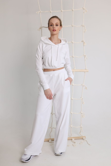 Трендовые натуральные широкие брюки на резинке в спортивном стиле. По бокм имеются карманы и атласные лампасы.