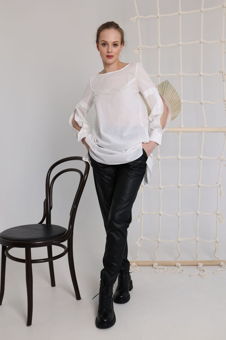 Брюки из очень приятной эко-кожи на хлопковой основе в спортивном стиле на резинке с кабманами по бокам.