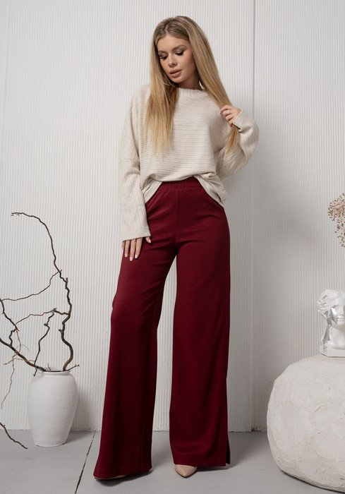 Модные брюки с разрезами по бокам. Ткань, имеет красивую структурную, немного глянцевую поветхность, очень плотная и в то же время очень хорошо тянется и утягивает. Верх на резинке, что тоже невероятно удобно и комфортно. Просто находка!