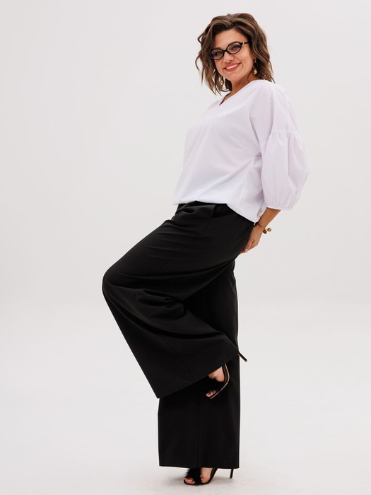 Элегантные брюки-палаццо с современным силуэтом. Модель отличается безупречным кроем с высокой посадкой, который подчеркивает талию и создает выразительный удлиненный контур. Широкие, ниспадающие мягкими складками штанины дарят образу воздушность и непринужденную пластику.