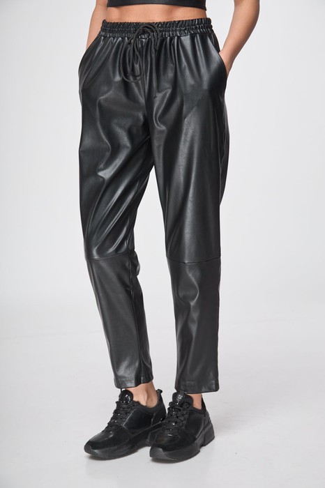 Брюки из эко-кожи с зауженным к низу кроем, обеспечивающим элегантный силуэт.