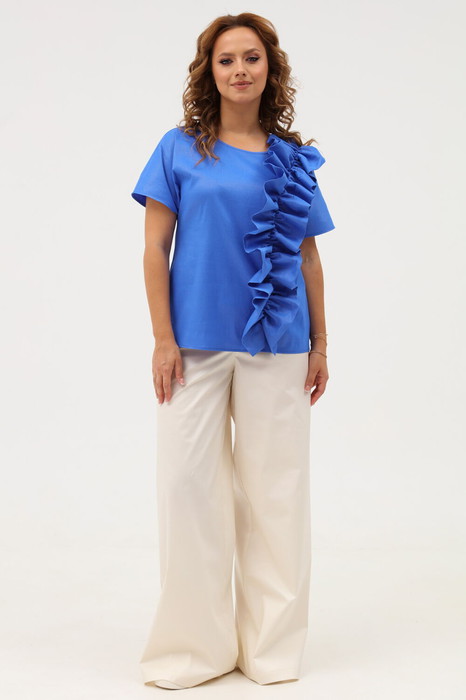 Брюки широкие прямые с высокой посадкой, на поясе со вставками из эластичной тесьмы. В боковых швах имеются функциональные наклонные карманы.