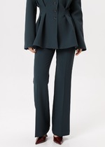 Брюки свободного кроя. Выполнены из костюмной ткани светло-серого цвета. В боковых швах карманы с отрезным бочком. Пояс на резинке. На Поясе имеются декоративные строчки. По переду имеется имитация застёжки. Длина 109 см