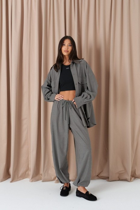 Брюки-джоггеры. Выполнены из мягкого текстильного полотна цвета серый меланж. Характеристики: прямой крой, пояс на резинке, в боковых швах карманы, штанина внизу на резинке с фиксатором. Длина 107 см.