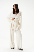 Брюки выполнены из атласной струящейся ткани черного цвета. Характеристики: прямой свободный крой, пояс на кулиске , в боковых швах карманы, декоративное кружево по низу изделия. Длина брюк 195 см.