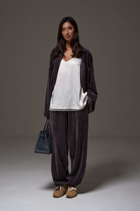 Брюки-джоггеры, выполнены из мягкого полотна велюра графитового цвета. Характеристики: прямой крой, пояс на резинке, в боковых швах карманы, на задней части изделия имитация карманов, штанина внизу на резинке с фиксатором. Длина 107 см.
