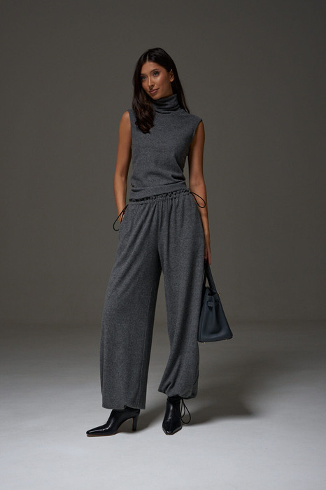 Брюки-джоггеры. Выполнены из мягкого ворсистого трикотажного полотна серого цвета. Характеристики: прямой крой, пояс на шнурке-резинке с фиксатором, в боковых швах карманы, штанина внизу на резинке с фиксатором. Длина 110 см.