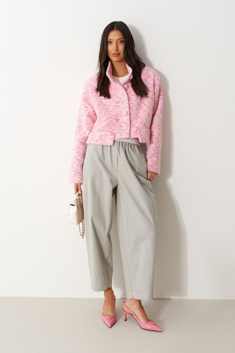 Брюки свободного кроя, зауженные к низу, выполнены из хлопкового полотна серого цвета . Характеристика: свободный крой, брючины заужаются к низу, пояс на резинке, имитация гульфика, в боковых швах карманы. Длина по боковому шву 94 см.