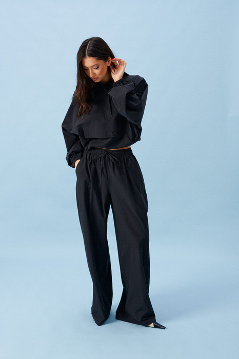 Брюки прямого кроя, выполнены из хлопкового полотна черного цвета. Характеристика: свободный крой, пояс на резинке со шнурочком, в боковых швах карманы, сзади изделия накладные функциональные карманы. Передние половины брюк разделены швом с отделочными строчками на уровне середины бедра. Длина по боковому шву 104 см.