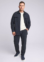 Брюки с карманами на молнии, молнии изнаночные, на замках висит брелок. Слева под карманом печать. На брюках сбоку до колена вставка из ткани черного цвета с печатью. Брюки на манжете