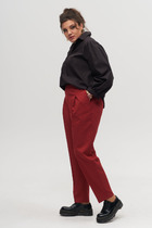 Брюки классические, прямые, слегка заужены к низу, по переду обработаны карманы с отрезным бочком, застежка на тесьму-молнию и 1 пуговицу. На задних половинках обработаны вытачки и имитация карманов в рамку с двумя обтачками, пояс в брюках притачной. По низу брюк в боковом шве есть небольшой разрез. Длина брюк от талии по боковому шву 97 см.