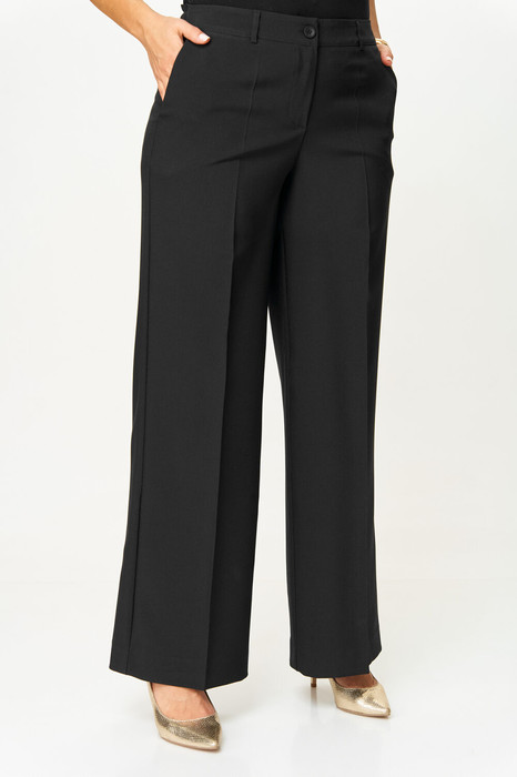 Брюки-палаццо,средней ширины,из текстильной ткани, выполнены с карманами с отрезным бочком в боковом шве. Пояс притачной, застёжка на молнию. По задним половинкам обработаны вытачки. Длина по боковому шву 108 см.
