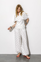 Брюки-шаровары из эко-кожи свободного силуэта, зауженные к низу, на притачном отсроченном поясе со вставленной в него резинкой. Полочка с карманом в рельефе. По переду и спинке фигурные рельефы.