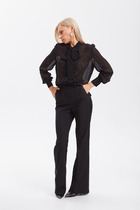 Брюки из трикотажного полотна с велюровым эффектом прямого силуэта на цельнокроеном отстроченном поясе со вставленной в него резинкой и декоративным шнурком. По бокам отрезной бочок с кантом и карманом в шве притачивания бочка.