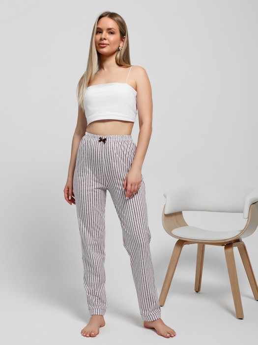 Брюки – из полотна с набивным рисунком в полоску, слегка зауженные книзу, с эластичной тесьмой по талии и притачными манжетами по низу. В центре переда по верхнему срезу прикреплен небольшой декоративный бантик из узкой атласной ленты.