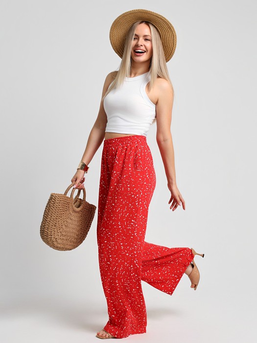 Брюки женские из тканого полотна "штапель" с набивным рисункомсвободного покроя, с карманами в боковых швах, на притачном поясе с эластичной тесьмой внутри.
