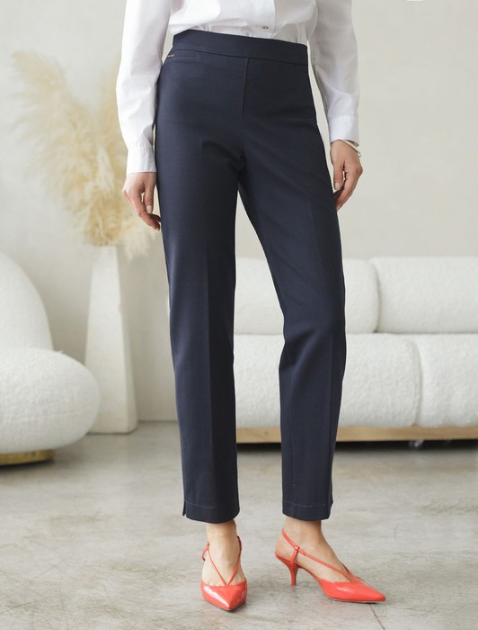 Состав: 50%Хлопок 30%ПУ 20%ПЭ Плотность: 390 Г/м2Брюки-дудочки выполнены из джерси. Модель дополнена резинкой сзади, одним вместительным карманом спереди и небольшими боковыми разрезами. Заутюженные стрелки и посадка на талии визуально вытягивают силуэт. Изделие хорошо держит форму, отлично тянется и почти не мнется во время использования. Идеальный вариант в офис или в повседневный классический стиль.