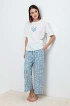 Модель свободного силуэта со значительным клешением брючин от линии бёдер и талией, акцентированной поясом из основной ткани.