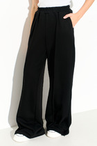 Брюки классические с заутюженными стрелками, слегка зауженные к низу, оформлены притачным поясом, частично на резинке. Застежка спереди брюк на молнию и петлю-пуговицу