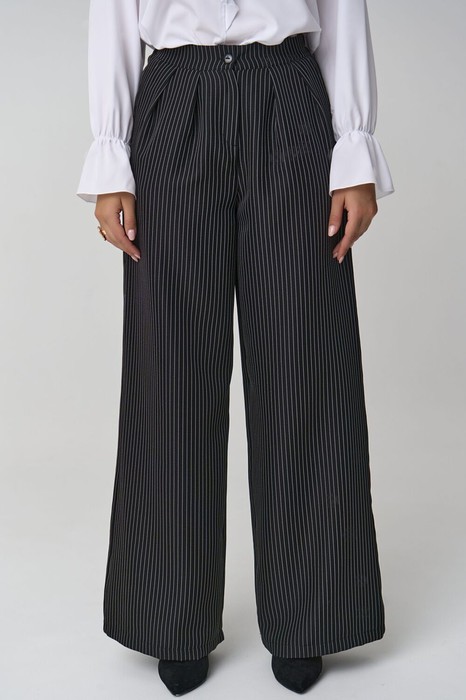 Элегантные брюки с высокой посадкой и акцентом на талии. Широкий силуэт с мягкими складками спереди создаёт свободную, струящуюся линию, а вертикальная тонкая полоска визуально вытягивает силуэт. Изготовлены из приятной к телу ткани, которая держит форму и остаётся комфортной в течение всего дня.