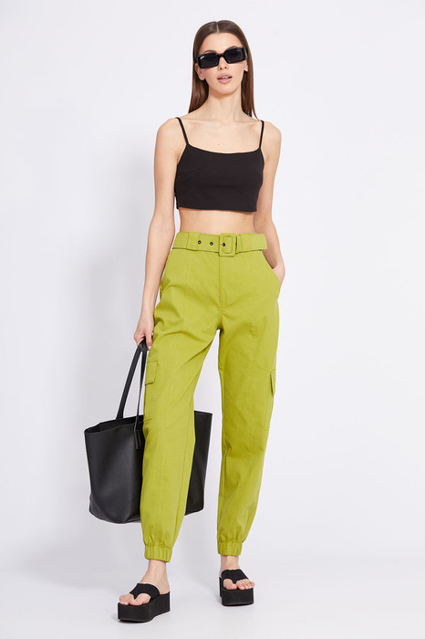 Брюки-карго выполнены из тонкого джинса. Брюки прямого покроя, на притачном поясе, в который частично вставлена эластичная тесьма по задней части. Спереди застежка на молнию с гульфиком и пуговицу. Карманы боковые с наклонным входом. Сзади накладные карманы, по боковым швам накладные карманы с клапанами. Низ брюк обработан манжетой с эластичной тесьмой. В комплект входит съемный ремень из основной ткани с обтяжной пряжкой.