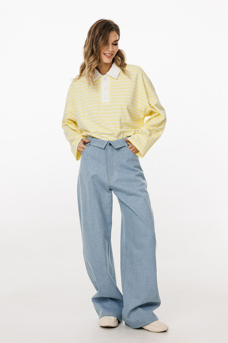 Брюки выполнены из плотного джинса. Брюки прямого силуэта, на притачном поясе, длиной в пол. На передних частях обработаны фигурные боковые карманы и застёжка на металлическую молнию и пуговицу. На задних частях обработаны кокетки и накладные карманы. Пояс выполнен с декоративным отворотом на лицо. По поясу обработаны 5 шлевок и декоративная петля.