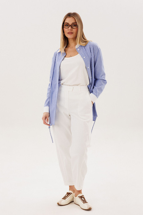 Брюки покроя "barrel", расширенные в области икры и зауженные к низу. Пояс притачной, эластичный в области спинки. По передним половинкам брюк-застежка и боковой наклонный карман. По задним-вертикальный шов. Боковой шов смещен в сторону центра передних половинок брюк. По низу-пата с регулирующими пуговицами, позволяющая создавать разную ширину брюк внизу.