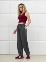 Брюки палаццо с притачным поясом из мягкой вельветовой ткани. Спереди застежка гульфик на молнии и петлей и пуговицей по поясу. По задней частям брюк вытачки. Пояс с резинкой в боковых частях. Брюки с заутюженными стрелками. Длина брюк с учетом пояса - 109 см.