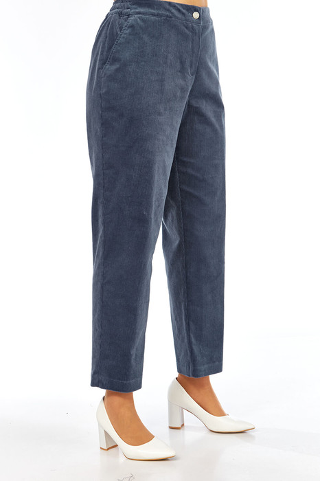 "Брюки женские, свободного силуэта, выполнены  из хлопкового вельвета. Пояс притачной, частично на резинке. Застежка на молнию, петлю и пуговицу. В передних деталях брюк обработаны боковые карманы с подрезным бочком.