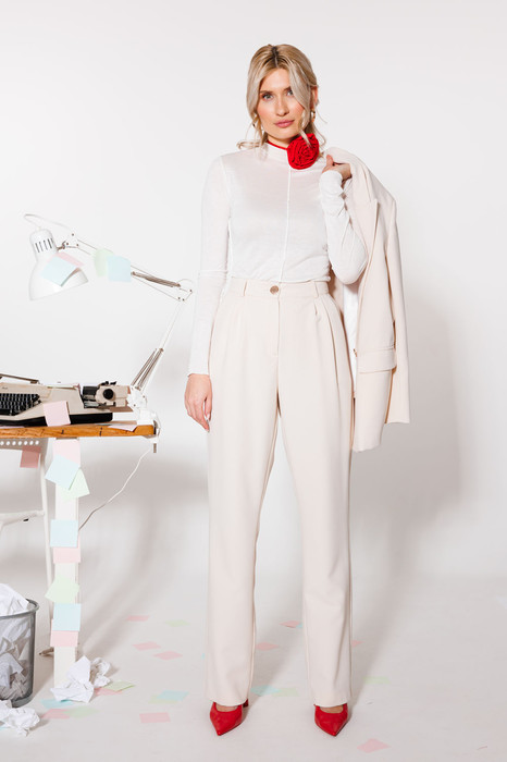 Базовые брюки с посадкой на талии и складками, которые визуально вытягивают силуэт, можно носить не только с туниками и толстовкам, но и с рубашками и укороченными моделями. Мы выбрали для них плотную ткань на основе вискозы — такой материал благодаря добавлению искусственных волокон держит форму и отлично дышит.