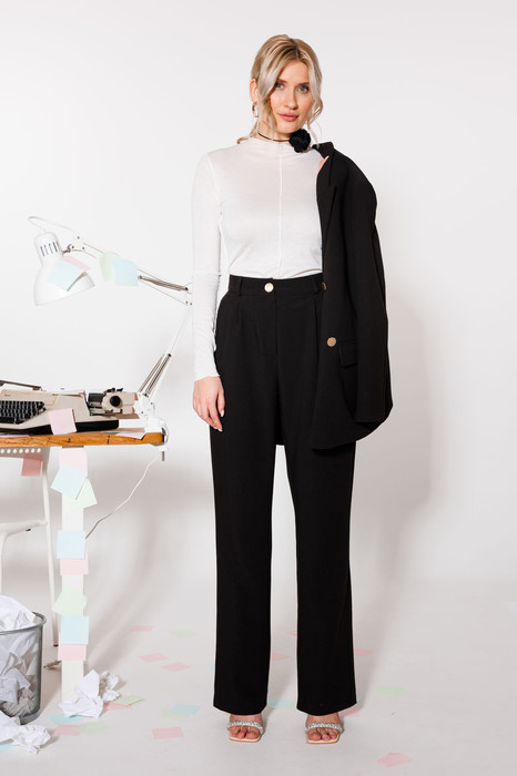 Базовые брюки с посадкой на талии и складками, которые визуально вытягивают силуэт, можно носить не только с туниками и толстовкам, но и с рубашками и укороченными моделями. Мы выбрали для них плотную ткань на основе вискозы — такой материал благодаря добавлению искусственных волокон держит форму и отлично дышит.